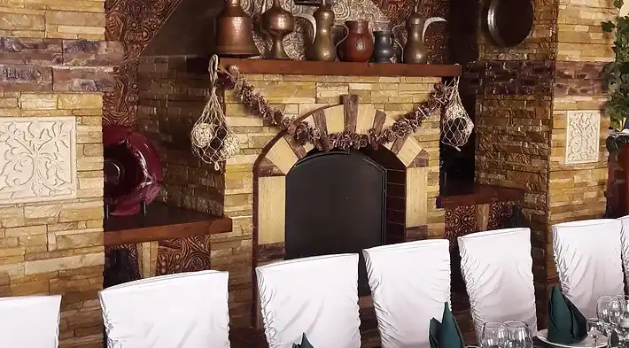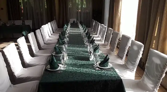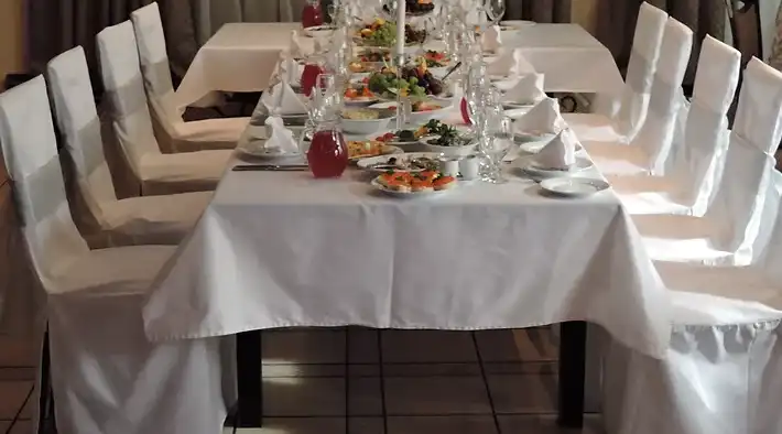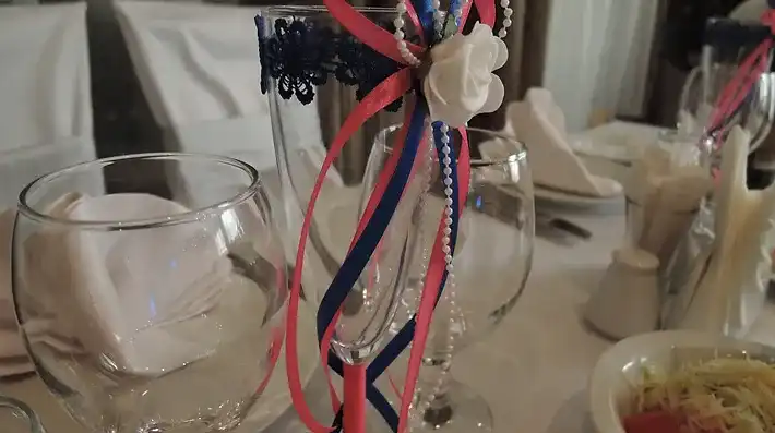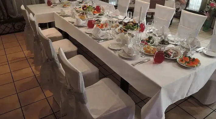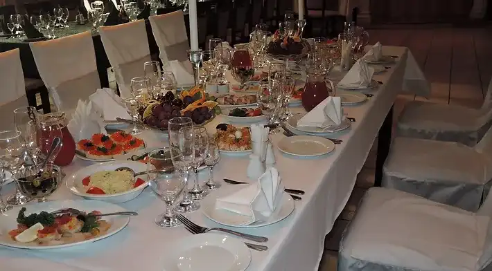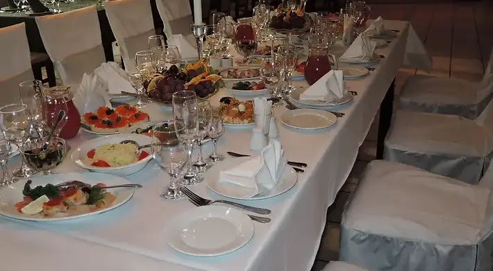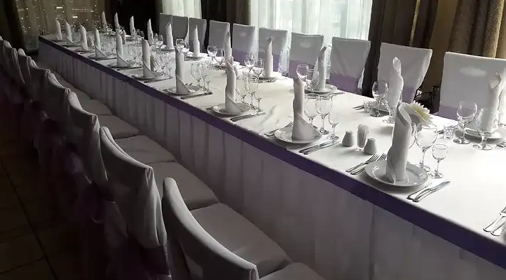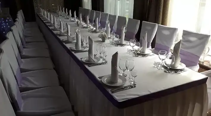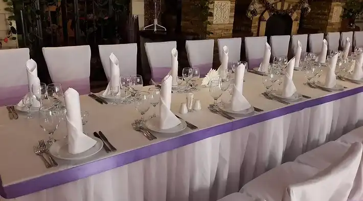 Оформление столов и залов: на выбор мы предлагаем 3 цвета скатертей - зеленые, белые и золотые. По умолчанию, стол для молодоженов комплектуется фуршетной юбкой и подсвечниками. За дополнительную плату мы предоставляем сервировку с белыми скатертями, салфетками и чехлами на стулья (стоимость 100 руб/с чел., примеры ниже на слайдшоу). Дополнительно разрешается украшать залы живыми цветами, воздушными шарами, текстильными композициями, украшать столы композициями из цветов, сооружать арку за столом для молодоженов.